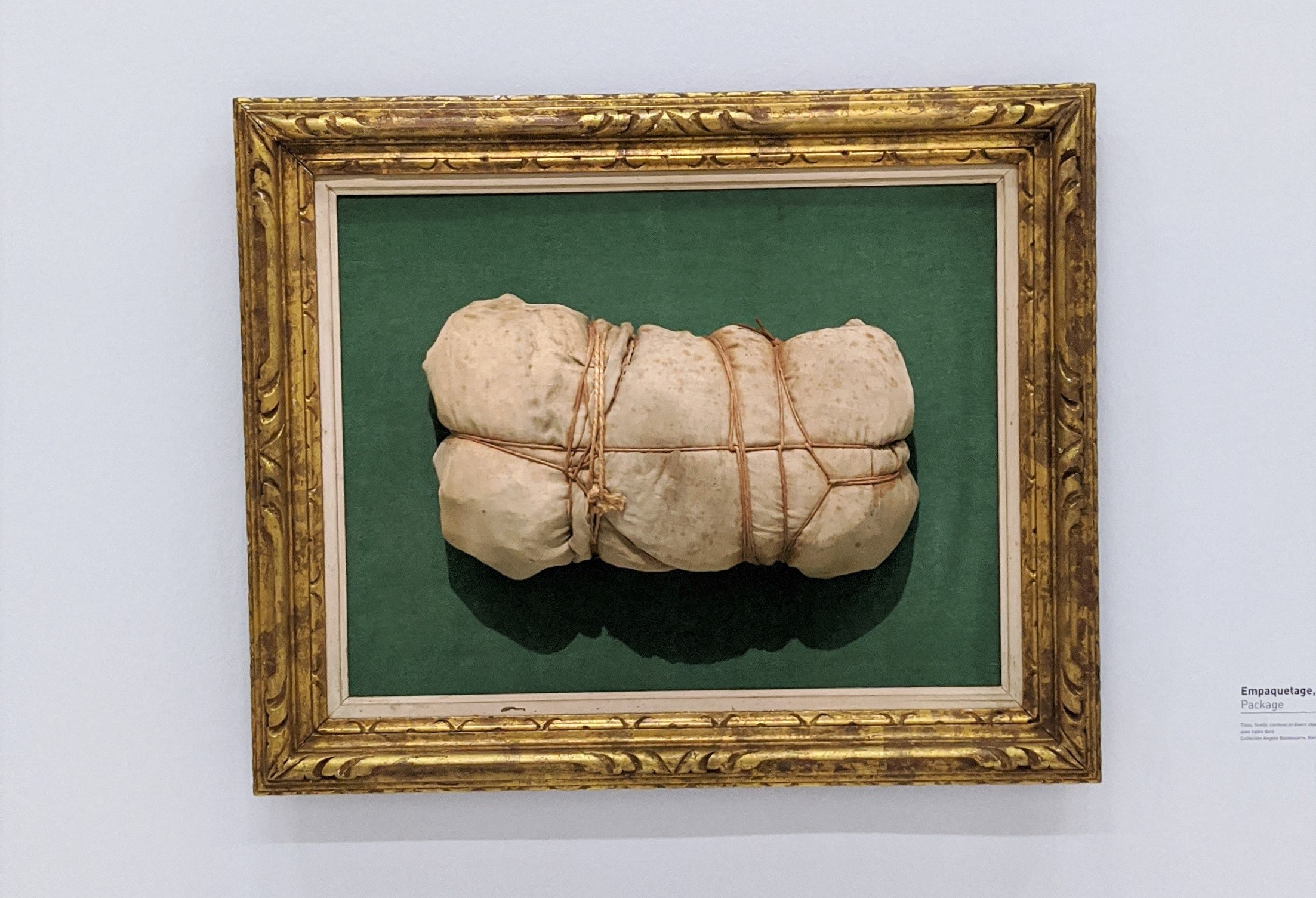 L’exposition, en deux parties, couvre d’abord les années 1958 à 1964, période parisienne où Christo pose son vocabulaire formel puis réalise ses premiers grands projets avec Jeanne-Claude. C’est pour fuir la dictature communiste de sa Bulgarie natale, mais aussi pour s’affranchir de la peinture réaliste-socialiste enseignée aux Beaux-Arts de Sofia, qu’il gagne la Ville Lumière en 1958. S’il portraiture la haute société parisienne pour gagner sa vie, ce sont ses expérimentations en parallèle qui le mèneront vers son style caractéristique. Dès le départ, les plis et les textures accidentées le fascinent : il commence à emballer de petits objets, comme des bouteilles ou des canettes, dont il solidifie le plissé avec de la laque. Ces premières œuvres emballées sont souvent enduites de sable, évoquant des objets poussiéreux oubliés. Leurs ombres sont accentuées avec de la peinture sombre, comme pour renforcer le contraste anguleux des formes. Les canettes emballées dégagent une certaine nostalgie, on les imagine exhumées d’une tranchée ou de ruines. Des objets du quotidien qui deviennent les reliques d’un temps passé. L’impression d’observer des sculptures en bronze est renforcée par l’aspect métallique du tissu laqué, ce qui ne manque pas de rappeler les sculptures compressées de César, déjà célèbre à la fin des années 1950.