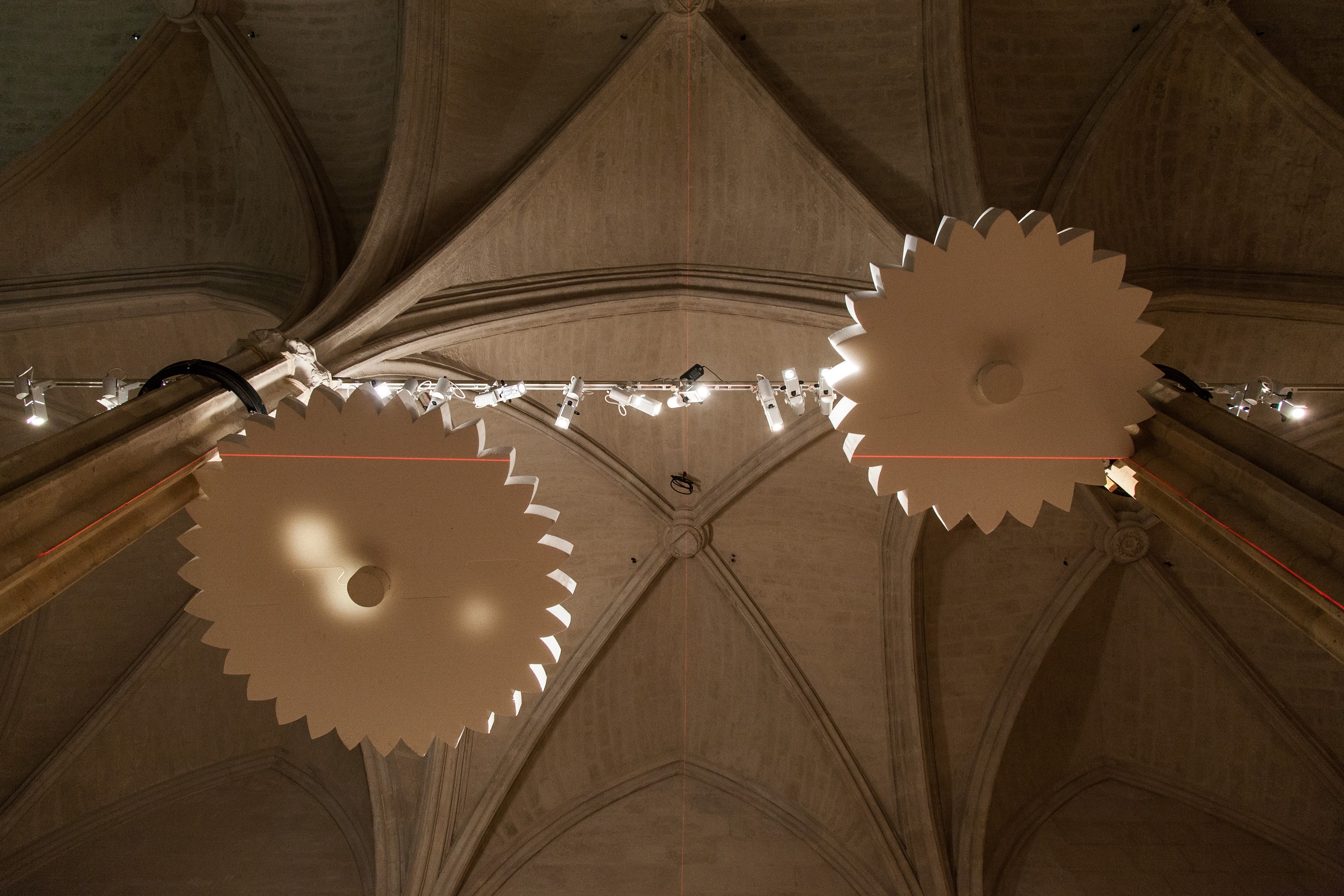 Comme le suggère le titre de l’exposition, « Tout est parti d’une colonne ». Les colonnes écrasantes de la sacristie ont été le point de départ de Lyes Hammadouche. Leur crénelage lui a rappelé celui d’engrenages, d’où l’oeuvre « Les développantes du cercle » qu’il a réalisé in-situ, et qui représente une série de mécanismes géants.